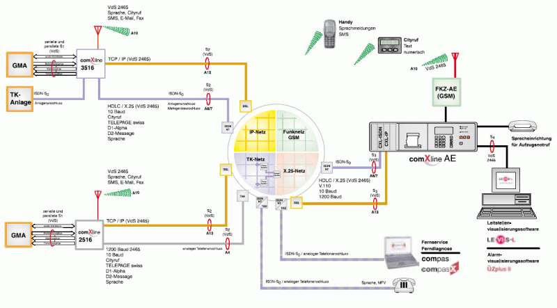 Die TELENOT-Alarmempfangseinrichtung comXline AE ermöglicht die Anbindung aller wichtigen Kommunikationswege (S3), wie Ethernet, ISDN oder Funk an Ihren Leitstellenrechner über die serielle Schnittstelle S4 gemäß der VdS-Richtlinie 465. Darüber hinaus stellt die comXline AE alle anderen nach VdS 466 geforderten Zusatzfunktionen zur Verfügung. Die Anforderungen der DIN EN 50136 werden ebenfalls erfüllt. Die Hardware der Kommunikationsmodule ist bereits für neue Protokolle vorbereitet.