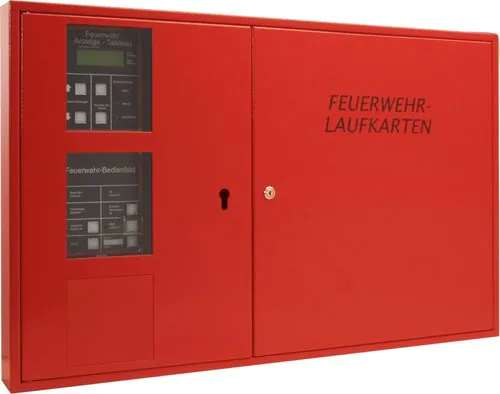 Zusatzinformationen: | FW-Info- und Bed.system f. A3 quer Laufkarten m. sep. Schliessung. Zweiflügeliges Stahlblechgehäuse für Aufputz- oder Unterputzmontage mit zentraler Türöffnung für beide Türflügel. Türöffnung durch Feuerwehrschließung (vorbereitet für Profilhalbzylinder-Einbau). Die linke Seite des Feuerwehrinformations- und Bediensystems (kurz: FIBS) beinhaltet ein Feuerwehranzeigetableau (kurz: FAT) nach DIN 14662 sowie ein Feuerwehrbedienfeld (kurz: FBF) nach DIN 14661 und ist vorbereitet zur Aufnahme einer Übertragungseinrichtung oder eines Handmelders. Die linke Tür ist mit Klarsichtfeldern für das FAT und das FBF ausgerüstet. Die Ansteuerung des FAT erfolgt über die serielle Schnittstelle der Brandmelderzentrale. Die rechte Seite des FIBS ist vorbereitet für die Aufnahme von bis zu 80 Feuerwehrlaufkarten mit der Türbeschriftung "Feuerwehr-Laufkarten". Das FIBS hat zwei separate Schließungen. Betriebsspannung 10 bis 30 V DC Ruhestrom @ 12 V DC ca. 50 mA Alarmstrom @ 12 V DC ca. 180 mA Gehäuse Stahlblech Farbe rot, ähnlich RAL3000 Gewicht ca. 17 kg Schutzart IP 30 Abmessungen (BxHxT) 830x560x100 mm