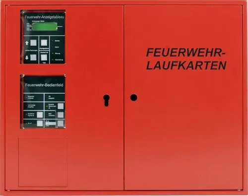 Zusatzinformationen: | FW-Info-& Bedienssystem Format A4. Feuerwehr-Informations- und Bediensystem mit redundantem FAT. Zweiflügliges Stahlblechgehäuse für Aufputz- und Unterputzmontage. Zentrale Türöffnung beider Türflügel. Vorbereitet für Halbzylindereinbau. Beinhaltet die Aufnahmefächer für max. 2x75 Feuerwehrlaufkarten DIN A4. Türöffnung über Halbzylinder linke Tür oder Riegel. Schloss nur rechte Tür.